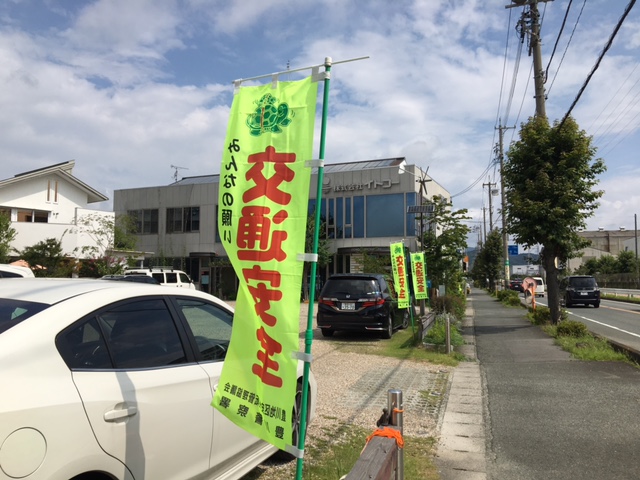 そして今週は イトコースクエア―の道路沿いの「のぼり」を交通安全に変えました。