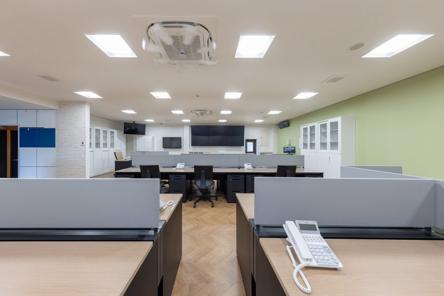 また、この事務所では、日中の電力を主に太陽光発電で賄い、経済的かつ環境に優しいクリーンエネルギーを利用しています。加えて、災害時や停電リスクに備え、蓄電池システムを併設しており、停電時には事務所の一部電力がバックアップされるため、業務の継続性も確保されています。