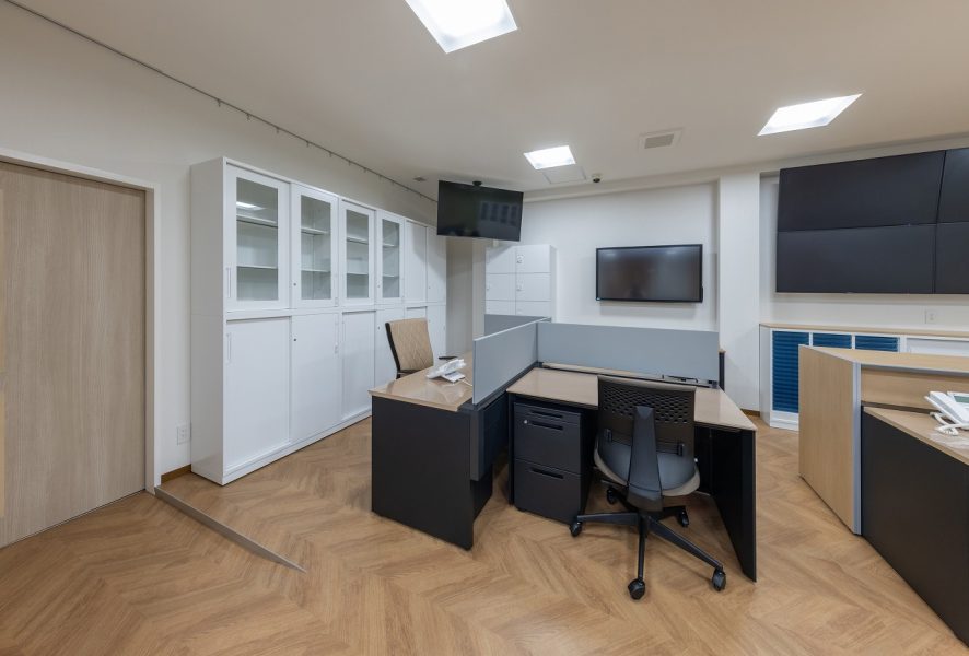 築30年の事務所をリノベーションし、社員が効率よく働けるようにレイアウトを工夫するとともに、今後の変化に対応できる配線や通信計画を盛り込み、柔軟なレイアウト変更を可能にしました。さらに、モダンなデザインと機能性を兼ね備えたスタイリッシュな空間に仕上げています。